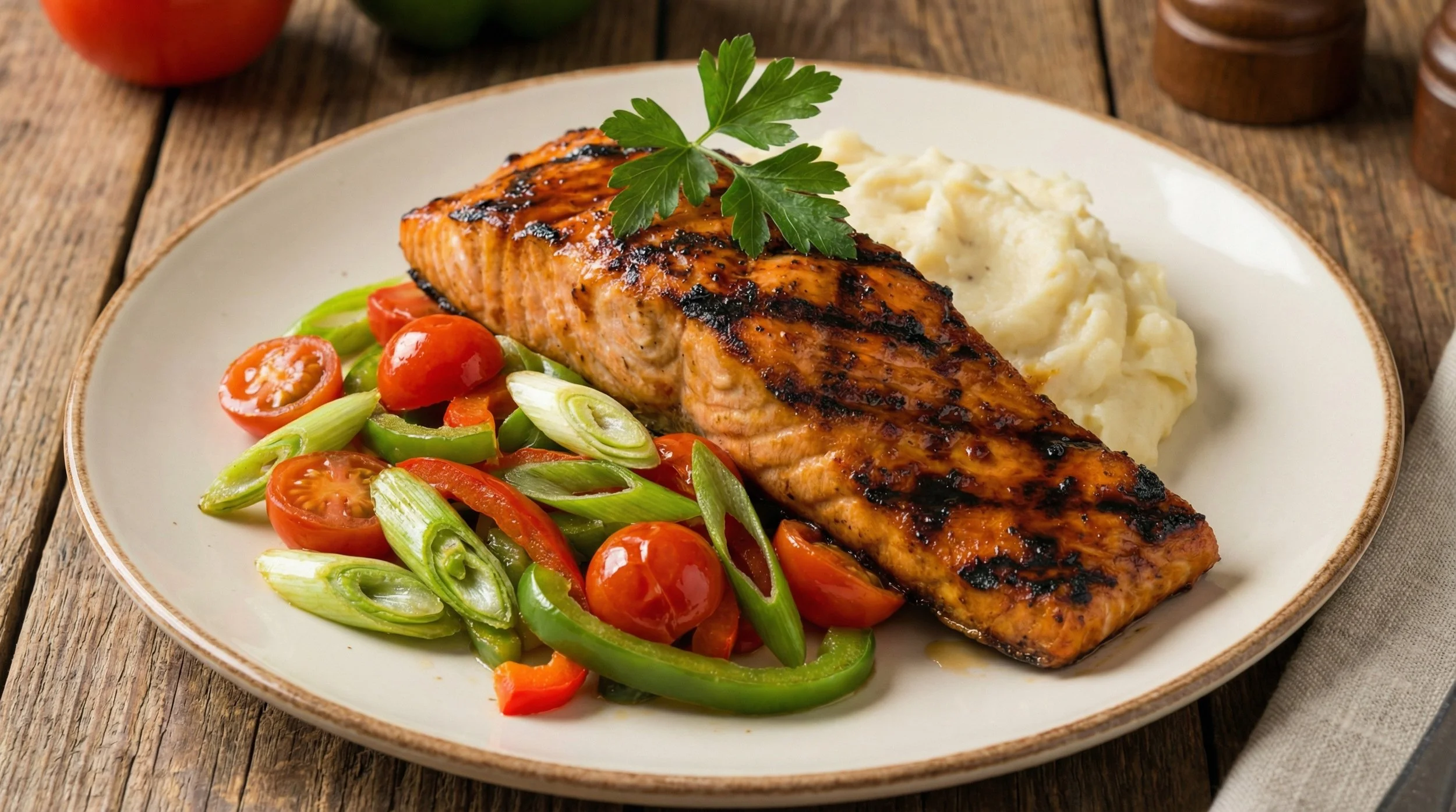 Charbroiled Bourbon Glazed Scottish Salmon, Sautéed Sweet and Sour Green Onion,